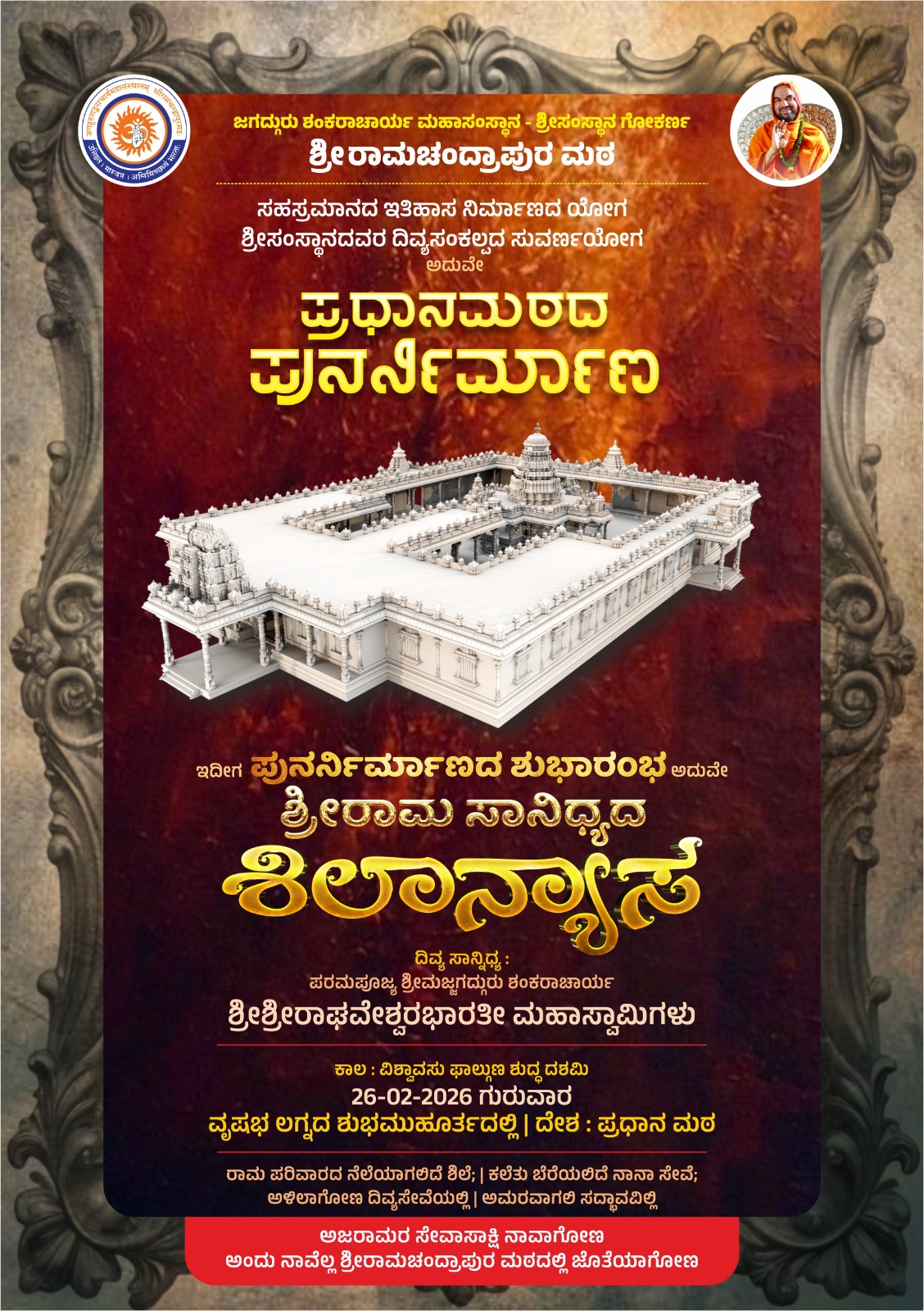 ಹೊಸನಗರ: ಸಹಸ್ರಮಾನದ ಇತಿಹಾಸ ನಿರ್ಮಾಣದ ಯೋಗ ಒದಗಿ ಬಂದಿದೆ. ಶ್ರೀಸಂಸ್ಥಾನದವರ ದಿವ್ಯಸಂಕಲ್ಪದ ಸುವರ್ಣಯೋಗವೇ ಪ್ರಧಾನಮಠದ ಪುನರ್ನಿರ್ಮಾಣ. ಪರಮಪೂಜ್ಯ ಶ್ರೀಮಜ್ಜಗದ್ಗುರು ಶಂಕರಾಚಾರ್ಯ ಶ್ರೀಶ್ರೀರಾಘವೇಶ್ವರಭಾರತೀ ಮಹಾಸ್ವಾಮಿಗಳವರ ದಿವ್ಯ ಸಾನ್ನಿಧ್ಯದಲ್ಲಿ, ವಿಶ್ವಾವಸು ಫಾಲ್ಗುನ ಶುದ್ಧ ದಶಮಿಯಂದು, (26-02-2026) ವೃಷಭ ಲಗ್ನದ ಶುಭಮುಹೂರ್ತದಲ್ಲಿ ಪ್ರಧಾನಮಠದಲ್ಲಿ ಶ್ರೀರಾಮ ಸಾನ್ನಿಧ್ಯದ ಶಿಲಾನ್ಯಾಸವು ನಡೆಯಲಿದೆ. ತನ್ಮೂಲಕ ಈ ಪುಣ್ಯ ಕಾರ್ಯಕ್ಕೆ ಶುಭಾರಂಭವು ಸಿಗಲಿದೆ. “ರಾಮ ಪರಿವಾರದ ನೆಲೆಯಾಗಲಿದೆ ಶಿಲೆ; ಕಲೆತು ಬೆರೆಯಲಿದೆ ನಾನಾ ಸೇವೆ; ಅಳಿಲಾಗೋಣ ದಿವ್ಯಸೇವೆಯಲ್ಲಿ ಅಮರವಾಗಲಿ ಸದ್ಭಾವವಿಲ್ಲಿ” ಎಂಬ ಭಾವದಲ್ಲಿ ಶಿಷ್ಯ-ಭಕ್ತರೆಲ್ಲರೂ ಅಜರಾಮರ […]