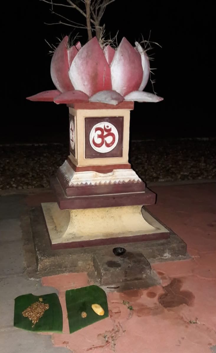 ಒಂದು ಬಾಳೆಲೆಲಿ ಅರಶಿನ ಕೊಂಬು, ಮಸಿ ಗಟ್ಟಿ, ಬಾಗೆ ಹೊಡಿ, ಗೊಂಪಿನ ಸೊಪ್ಪು, ಕುಂಕುಮ, ಚೆಂಬಿಲ್ಲಿ ನೀರು ಎಲ್ಲವನ್ನೂ ಮಡುಗಿ ದೇವಿಗೆ ಕೊಡುದು.