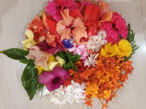 ಒಂದೊಂದು ಬಣ್ಣದ ಹೂಗುಗಳನ್ನು ಕೊಯ್ದು ಚೆಂದಕೆ ಹರಿವಾಣಲ್ಲಿ ಜೋಡಿಸಿಯಪ್ಪಗ ಮನಸ್ಸಿಂಗಪ್ಪ ಒಂದು ಕೊಶಿಯೇ ಬೇರೆ. ನಮ್ಮ ಮಠಲ್ಲಿ ಶ್ರೀಕರಾರ್ಚಿತ ಪೂಜೆಗೆ ಹೆಮ್ಮಕ್ಕೊ ಎಲ್ಲ ಸೇರಿ ಎಷ್ಟು ಚೆಂದಕೆ ಹೂಗುಗಳ ವಿಂಗಡಿಸಿ ಮಡುಗುತ್ತವು. ಶ್ರೀಕರಾರ್ಚಿತ ಪೂಜೆಯ ನಮಗೆಲ್ಲ ನೋಡಿ ಗೊಂತಿದ್ದು. ಬಣ್ಣ ಬಣ್ಣದ ಹೂಗುಗಳಿಂದ ಅಲಂಕಾರ ಮಾಡಿದ ಆ ದೇವರ ನೋಡುದೇ ಮನಸ್ಸಿಂಗೆ ತಂಪು. ನಮ್ಮ ಮನಸ್ಸಿನ ಎಲ್ಲಾ ಸಂಕಟವು ಮರದು ಹೋವ್ತು.