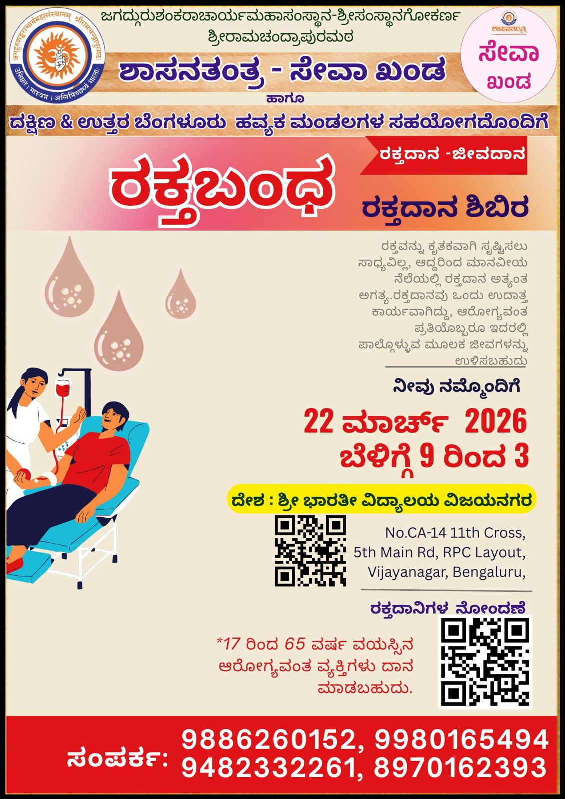 ಪರಮಪೂಜ್ಯ ಶ್ರೀಮಜ್ಜಗದ್ಗುರು ಶಂಕರಾಚಾರ್ಯ ಶ್ರೀಶ್ರೀರಾಘವೇಶ್ವರಭಾರತೀ ಮಹಾಸ್ವಾಮಿಗಳವರ ಸಂನ್ಯಾಸ ಸ್ವೀಕಾರದ ದಿನದಂದು ಶ್ರೀಮಠದ ಶಾಸನತಂತ್ರದ ಸೇವಾಖಂಡವು ಬೆಂಗಳೂರಿನ ದಕ್ಷಿಣ ಹಾಗೂ ಉತ್ತರ ಮಂಡಲಗಳ ಸಹಕಾರದೊಂದಿಗೆ *ರಕ್ತಬಂಧ* ಎನ್ನುವ ರಕ್ತದಾನ ಶಿಬಿರವನ್ನು ಆಯೋಜಿಸುತ್ತಿದೆ.